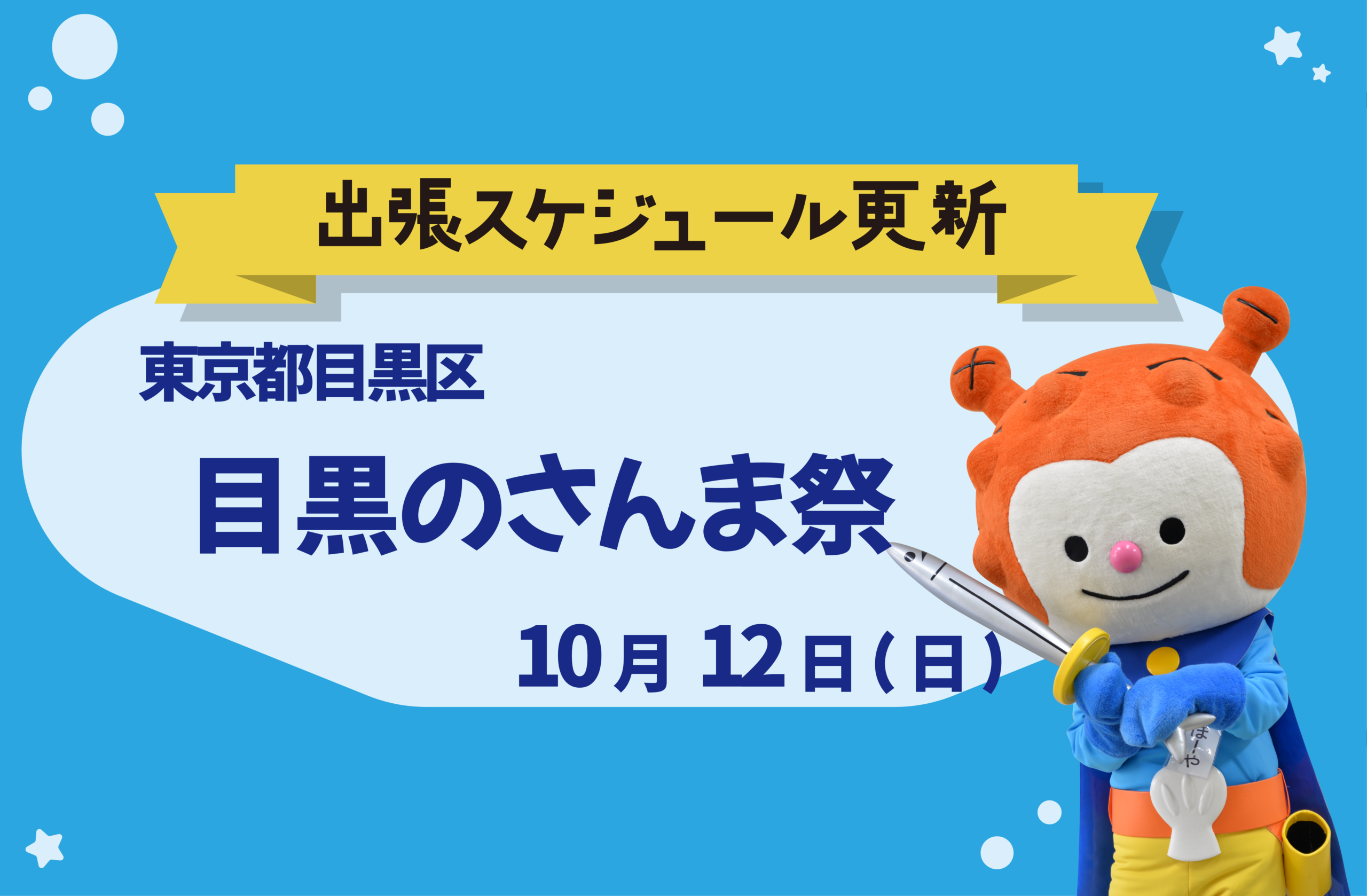 内容:気仙沼市の友好都市である目黒区のお祭り「目黒区民まつり」内で行われる「目黒のさんま祭」の会場にホヤぼーやもお邪魔します!