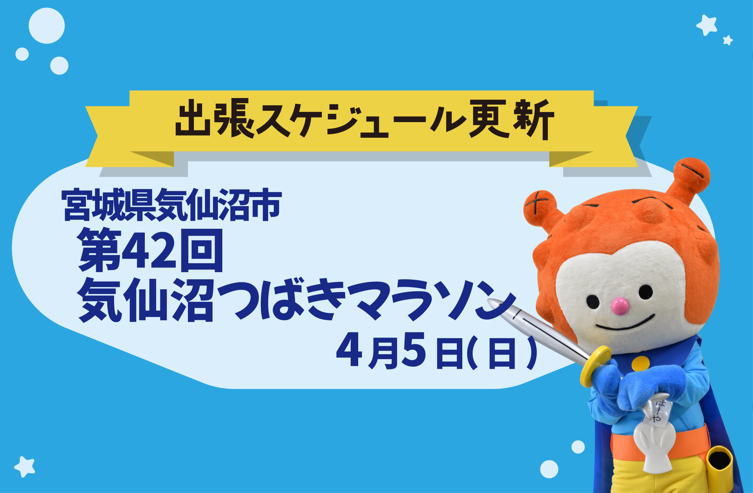 日時:2026年4月5日(日)8:45開会式、10:30頃表彰式予定 場所:気仙沼市立大島小学校(宮城県気仙沼市高井40-2)ほか 内容:緑の真珠と称される気仙沼大島の椿咲く爽やかな海浜コースを走るマラソン大会にホヤぼーやも応援に駆けつけます! ホヤぼーやはイベント開催時間内随時、会場内でランナーさんを応援する予定です★