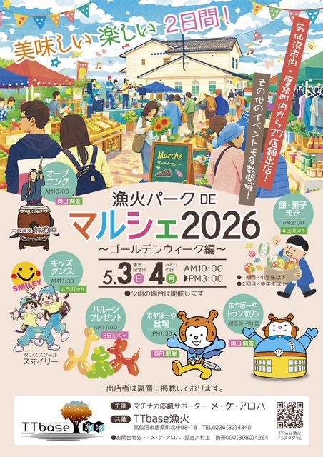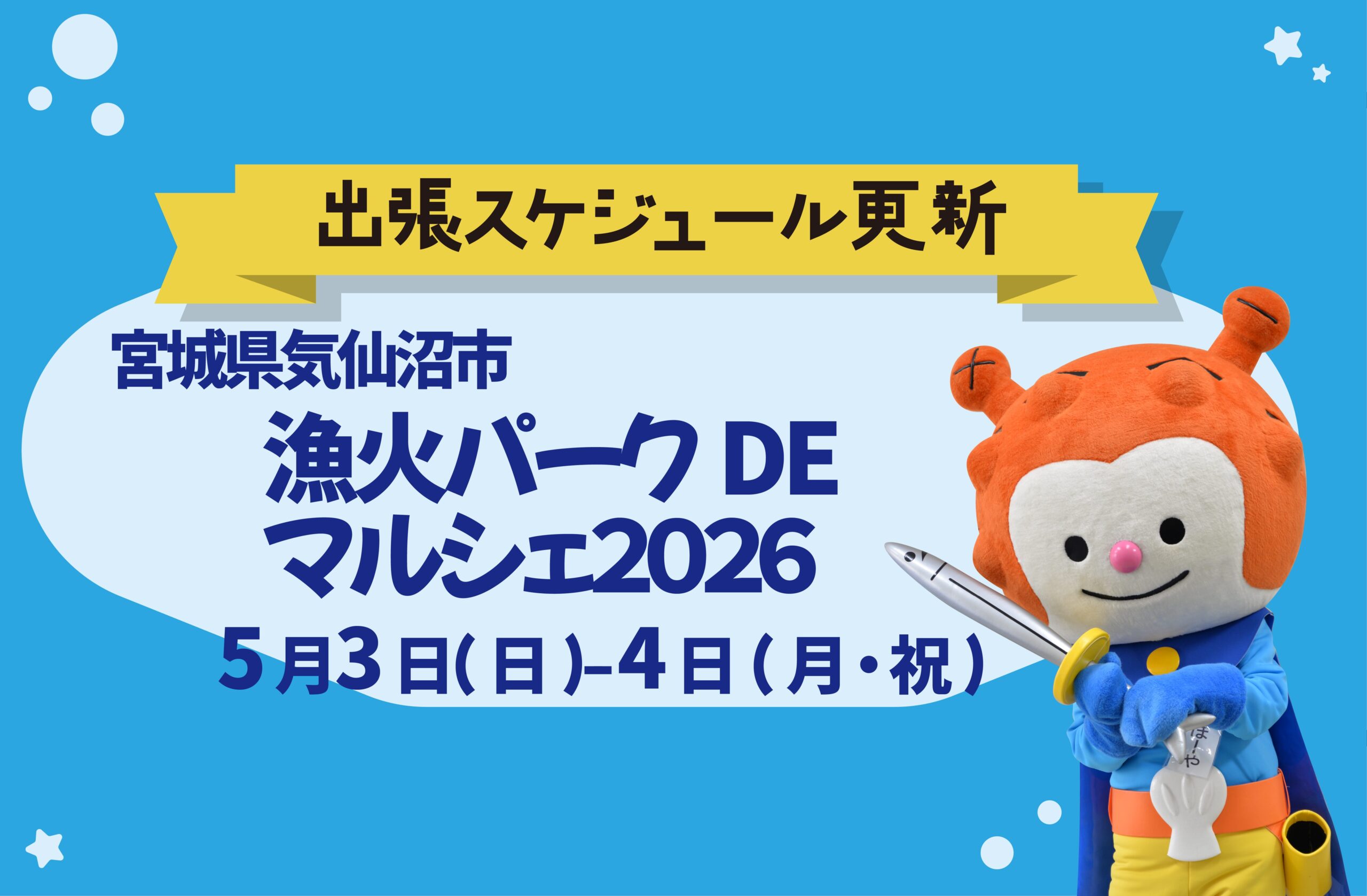 日時:2026年5月3(日)、4(月・祝)10:00〜15:00 場所:漁火パーク(宮城県気仙沼市唐桑町北中98−18) 内容:気仙沼市内のさまざまな出店が唐桑半島・漁火パークに大集合! 子ども向けの餅まき・お菓子まきもあり、GW期間中、家族でお楽しみいただけるイベントとなっております。 ホヤぼーやの登場は13:30〜14:30の間の予定です。 写真撮影を希望の方は、会場内でホヤぼーやに話しかけてみてくださいね。
