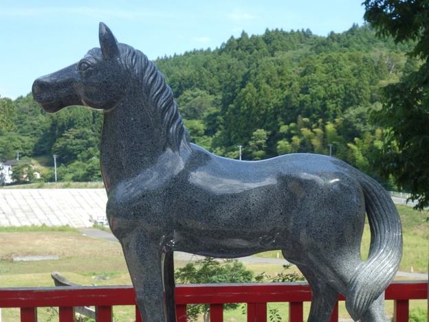また、漁火パークから車で7分の早馬神社は境内には神馬像の「撫で馬」があります。