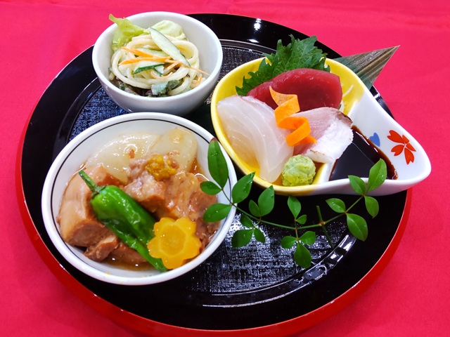 豚角煮と刺身の小鉢(+¥300であさり汁とご飯付)