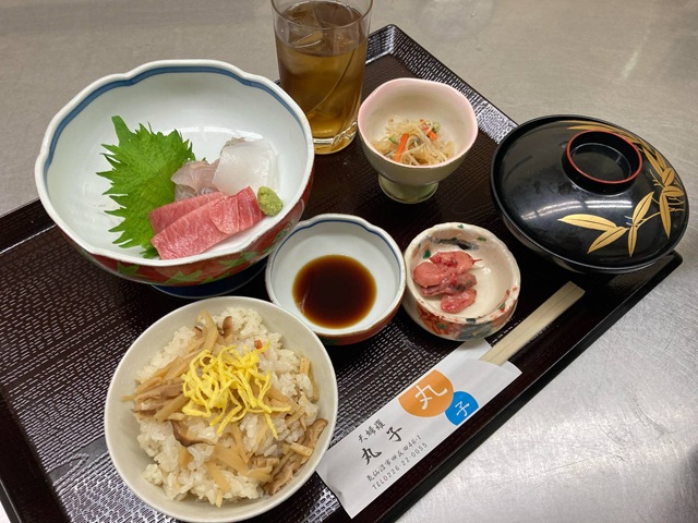 本マグロと季節の旬のお刺身と炊き込みご飯のミニセットになります。