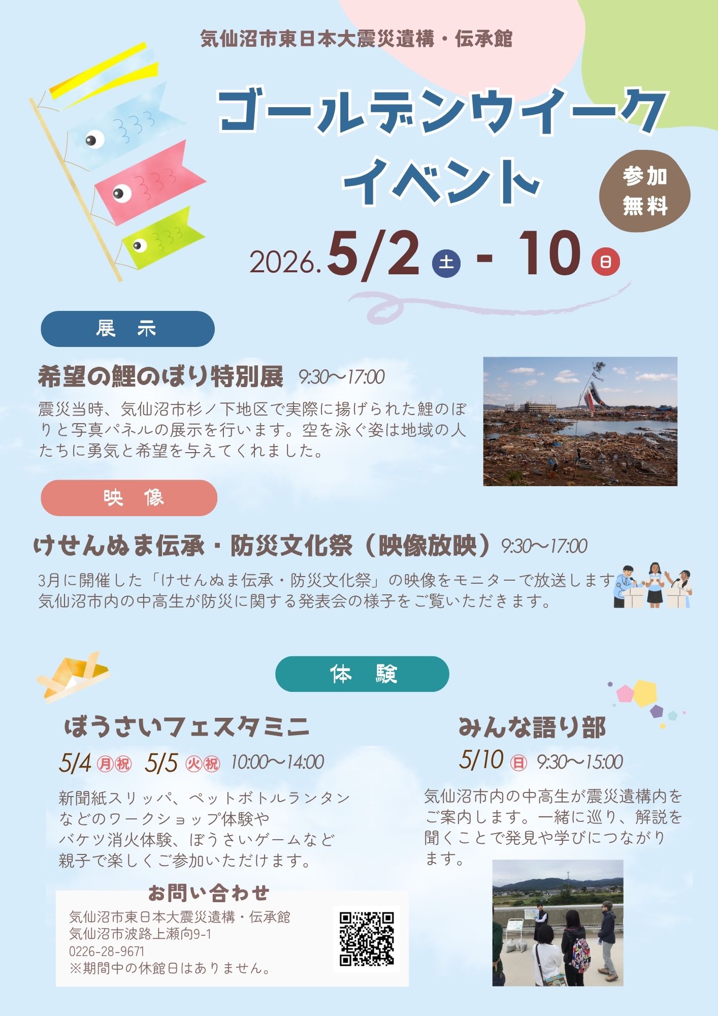 防災ワークショップ体験のほか、希望の鯉のぼりの展示、けせんぬま伝承・防災文化祭の映像放映、地元の中高生による館内ガイドなど開催します。