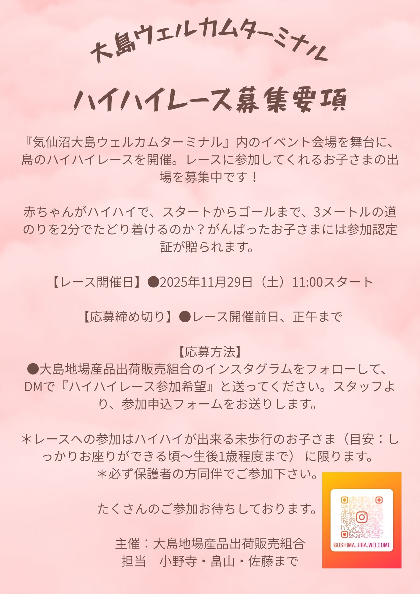お申込みは大島地場産品出荷販売組合インスタグラムをフォローして、DMで『ハイハイレース参加希望』とお送りください。