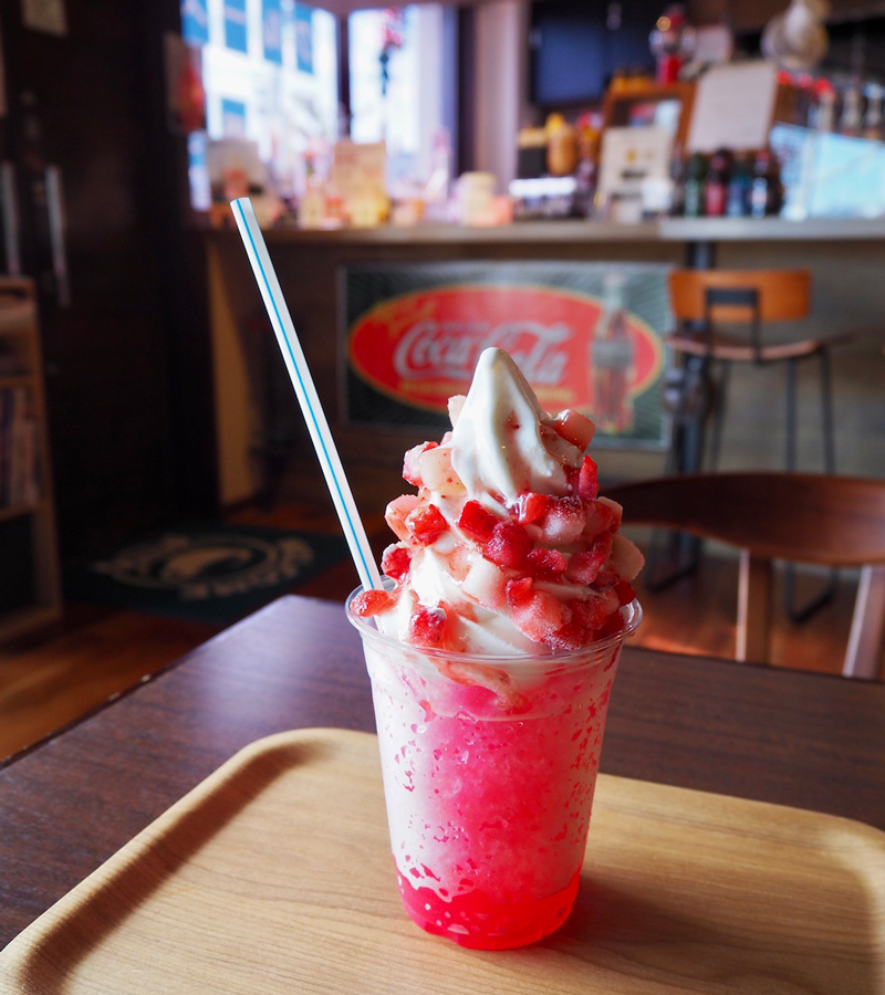 モーランド牧場の濃厚でミルク感たっぷりのソフトクリームに、シャリっとしたイチゴかき氷を合わせた「果実のイチゴフラッペ」。その上には冷凍イチゴと甘酸っぱいイチゴソースが贅沢にトッピングされており、暑い日にぴったりのひんやりスイーツです。