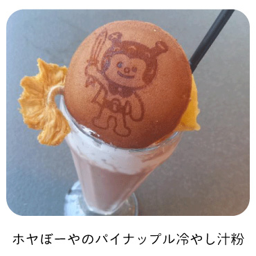 地元気仙沼の菓匠 紅梅のホヤぼーやどら焼きが可愛い夏メニュー。パイナップルのジューシーな果実感がアクセントのひんやり涼しいお汁粉のドリンクです。