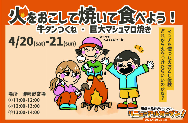 実際におこした火で、宮城名物・牛タンを使ったつくねか巨大マシュマロのうち、お好きな方を選んで焼いておいしく食べるところまでが体験メニューです!