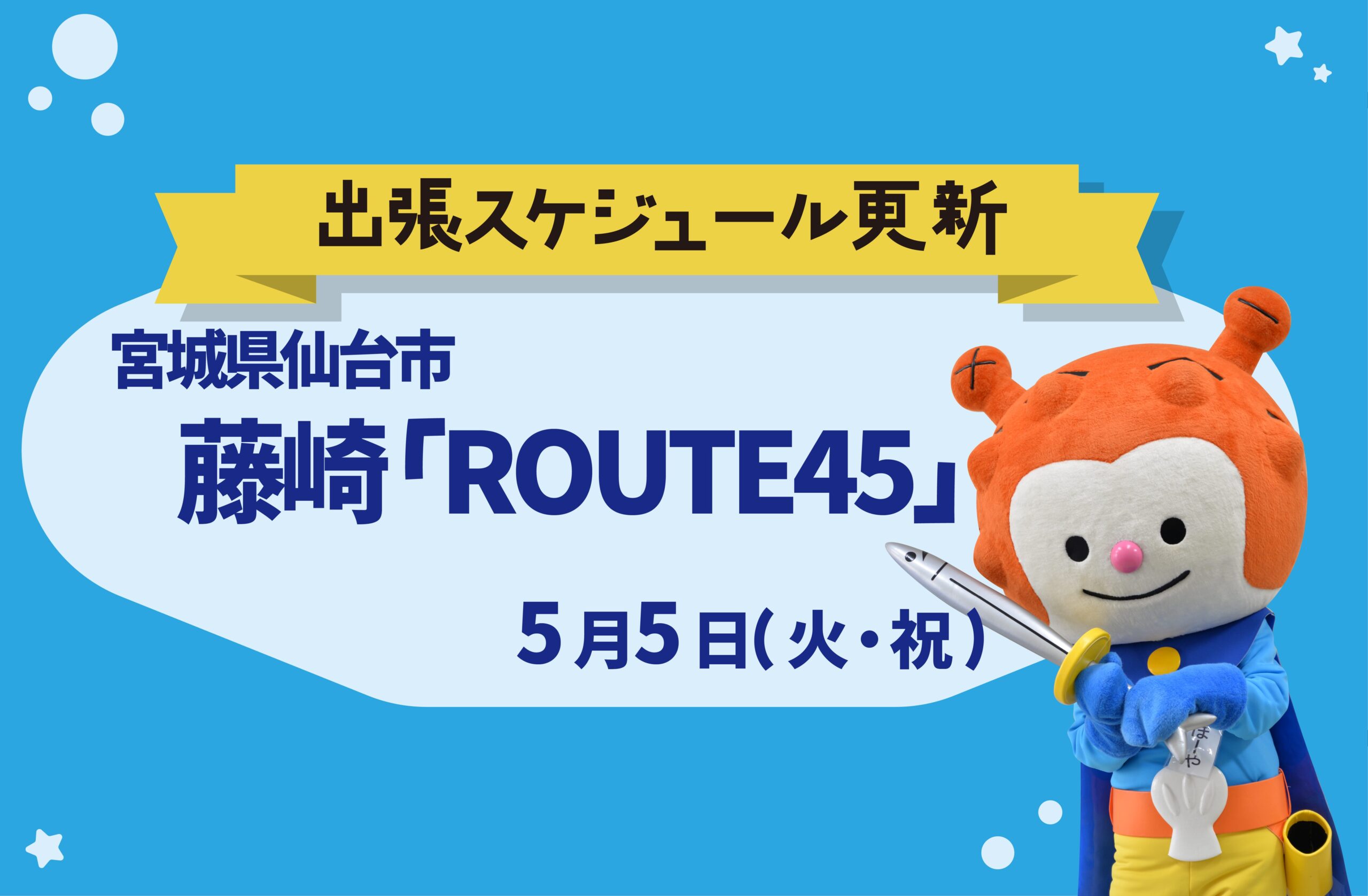 内容:仙台 藤崎で4/30~5/6に開催される、国道45号線沿いの地域の特産品を一同に集めた「ROUTE45」。期間中、気仙沼コーナーにはホヤぼーやグッズ約70種、お菓子やコーヒーなどが並びます。