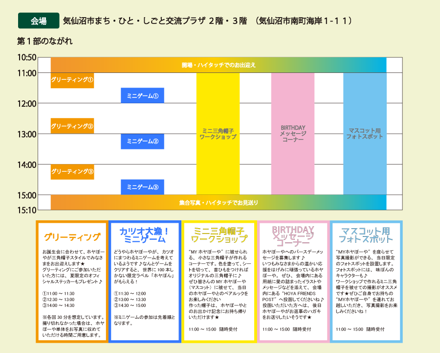 ※各回30分を想定しておりますが、ツーショットが撮り切れなかった場合は、ホヤぼーや単体をお写真に収めていただける時間をご用意いたします。ぜひ次のグリーティングを狙ってご参加ください。