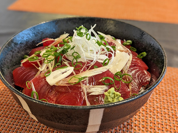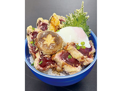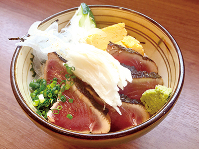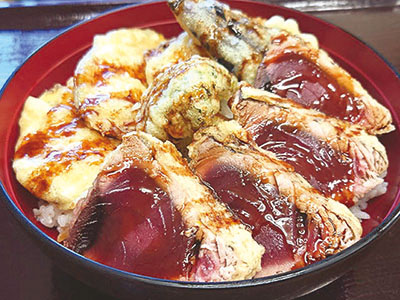 「亀洋丸」の一本釣りかつおを使用!とろりと旨みあふれるかつおの刺身と香ばしく炙ったかつおのたたきを2種丼で提供します。