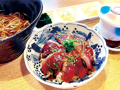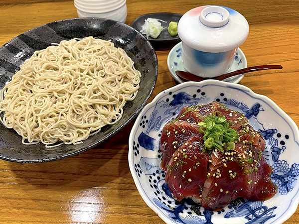 べっこう醤油で味付けしたかつおの手こね寿司に、手打ちのざるそばと茶碗蒸しが付きます。