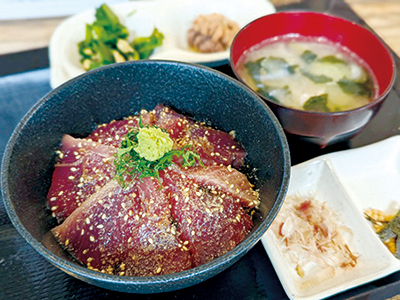 「亀洋丸」の一本釣りかつおを使用した、店長こだわりの「かつおのたたきの漬け丼」を提供。アクセントにとろろと温泉卵をのせ、まろやかさと香ばしさが絶妙に絡み合うクセになる味に仕上がりました。かつおの旨味を引き出した握り寿司やたたきの握り寿司(いずれも2貫220円)もあります。