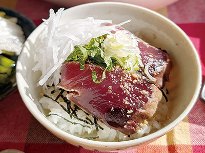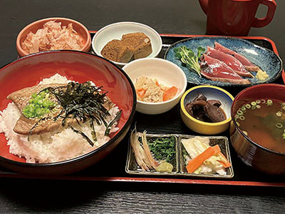 鰹のおなか部分で、最も脂がのっている部位である「ハラス」。これをほどよく焼いてご飯に乗せました!鰹のタタキや地元で「星」と呼ばれ重宝される心臓の煮つけ、さらには地元の郷土料理も付いたお得なセットです。出汁茶漬けにしても美味です。