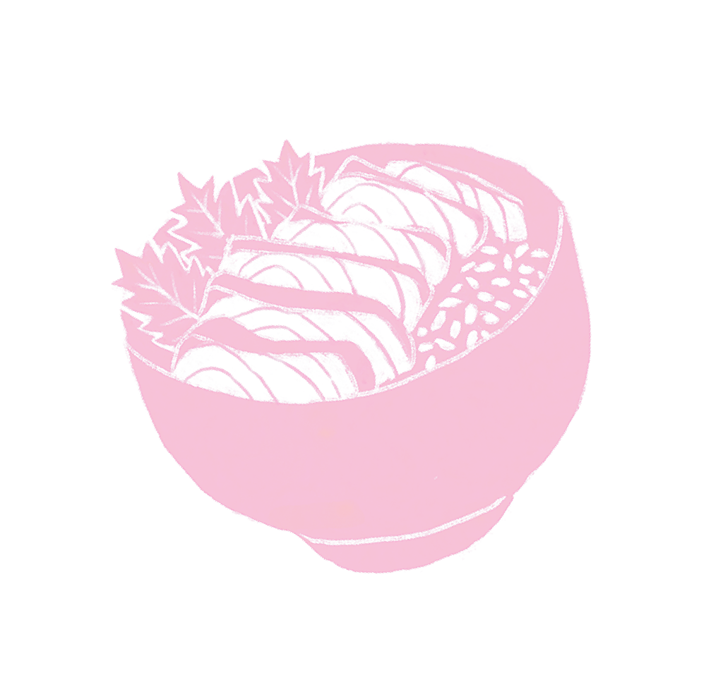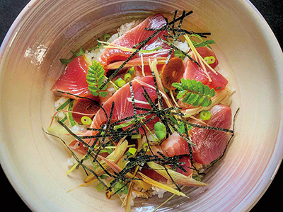 にんにく醤油ベースの特製ダレに漬けたかつおを、酢飯の上に。ミョウガ、ねぎ、大葉、たっぷりの薬味と一緒にいただきます。にんにくのアクセントが効いて、食べると元気が出てきます!