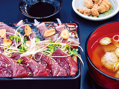 遠洋かつお一本釣り船「亀洋丸」が釣り揚げたかつおを塩麹に漬けた炙りと鹿児島県枕崎産の甘醤油漬けを一度に楽しめるメニューです!サメとさんまのつみれ汁とまぐろの卵の煮つけも付いています。
