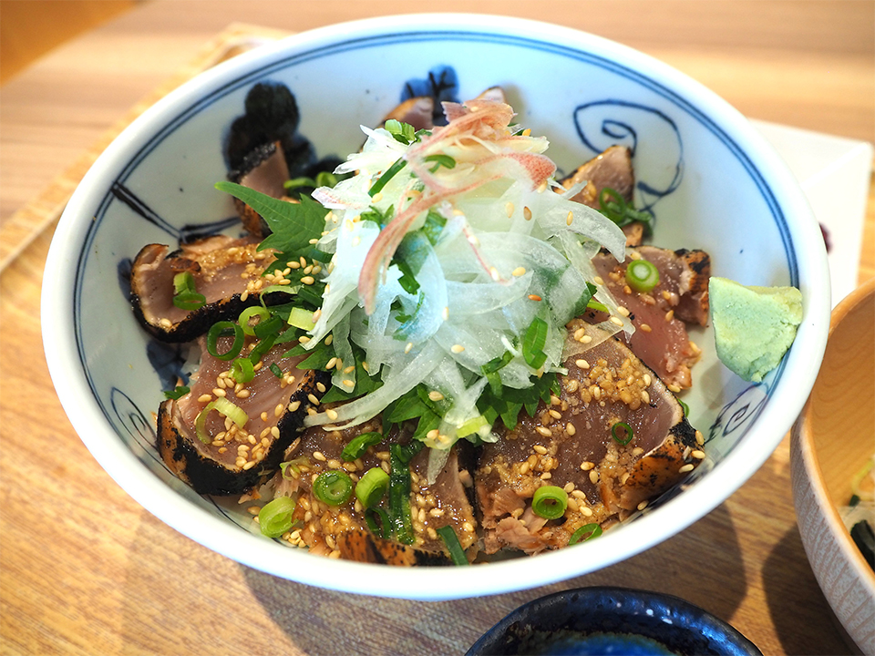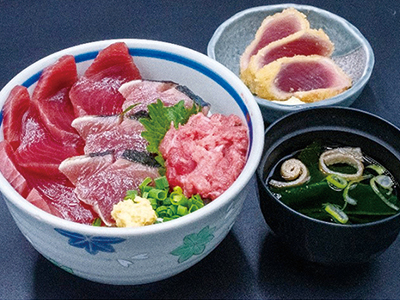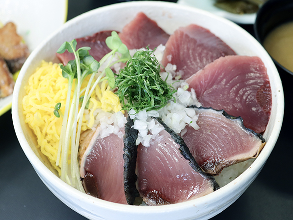 かつおの塩たたき、漬け、生身の3種類を食べ比べできるかつお丼。小鉢、汁物とセットのランチタイムメニューです。