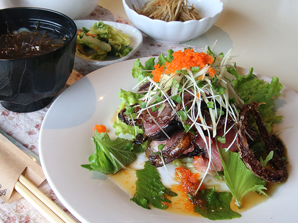 旬のかつおに、揚げナス・オニオンリングなどがミルフィーユ状に重ねてあります。そこに醤油ベースのドレッシングという合わせ技!生姜のアクセントもたまりません。※土日のみ提供となります。