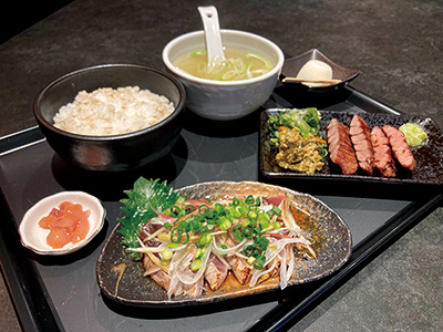 オリジナルポン酢(オリぽん)でうまみを引きたて、コクがある味わいに仕上げたかつおのたたきと、職人が丁寧に焼き上げた「極上牛たん焼き」が一つのセットで堪能できる夢のコラボ定食。いかの塩辛、麦ごはん、テールスープ、ミニデザート付き。※土日祝ランチタイム限定。
