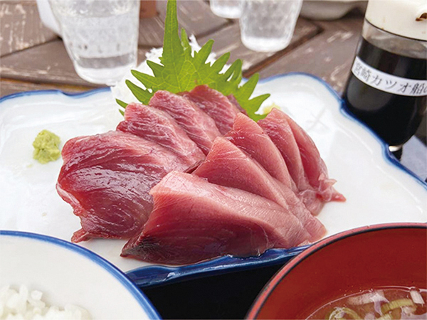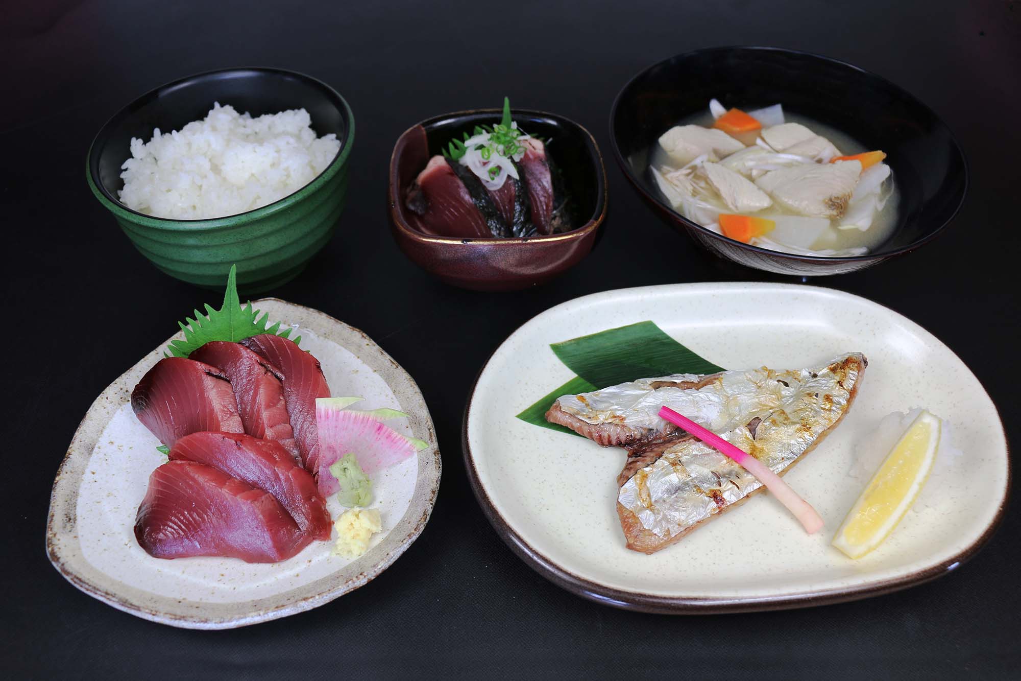 鮮かつお5貫とマグロ、白身魚等の地場刺身がセットの定食です。