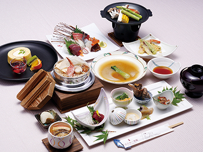かつおのなまり節から出汁をとったスープで作るフカヒレ姿煮(1人前120g)をメインに、旬の食材を使った前菜や小鉢、天ぷら、デザートなどがついたプレミアムフカヒレの会席料理。フカヒレのサイズが100gになるAランクフカヒレ三昧会席(9,400円)と、フカヒレ丼のセット(4,700円)も選べます。