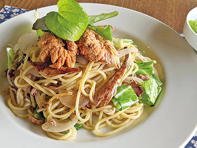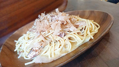 丁寧な技でつくられた鰹節の香りを濃厚カルボナーラにまとわせ、ベーコンの替わりに“サラダかつお”を入れたメニューです。