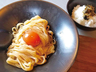 伝統的な手火山式で作るマルヤマの鰹節のうまみと香りを低温のオイルで抽出した自家製の「鰹薫香オイル」、地元の醤油を使った特製タレ、こだわりぬいた「森の芽吹き卵」を特注の平打ち麺にからめていただきます。究極のTKM(たまごかけ麺)が誕生しました!〆飯付き。