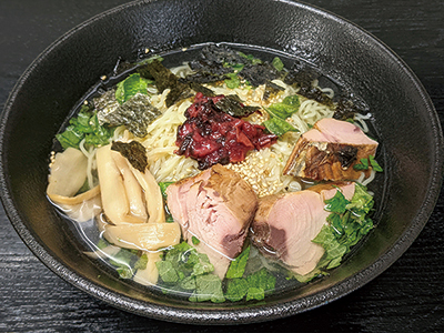 気仙沼産のかつお節と鶏ガラで出汁を取った冷たいラーメンです。トッピングには気仙沼産のかつおのなまり節も使用し、よりかつおの旨みを感じていただけます。5年ものの梅干しを混ぜてお召し上がりください。残ったスープにご飯を入れて冷や汁にするのもおすすめです。