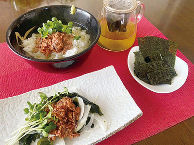 甘辛く仕上げた自家製かつおフレークと、地元の「當前海苔店」の海苔をご飯にかけてお茶漬けでいただきます。お酒のお供には、かつおフレークを単品でもお出しできます(ワカメと玉ねぎ添え、500円)。