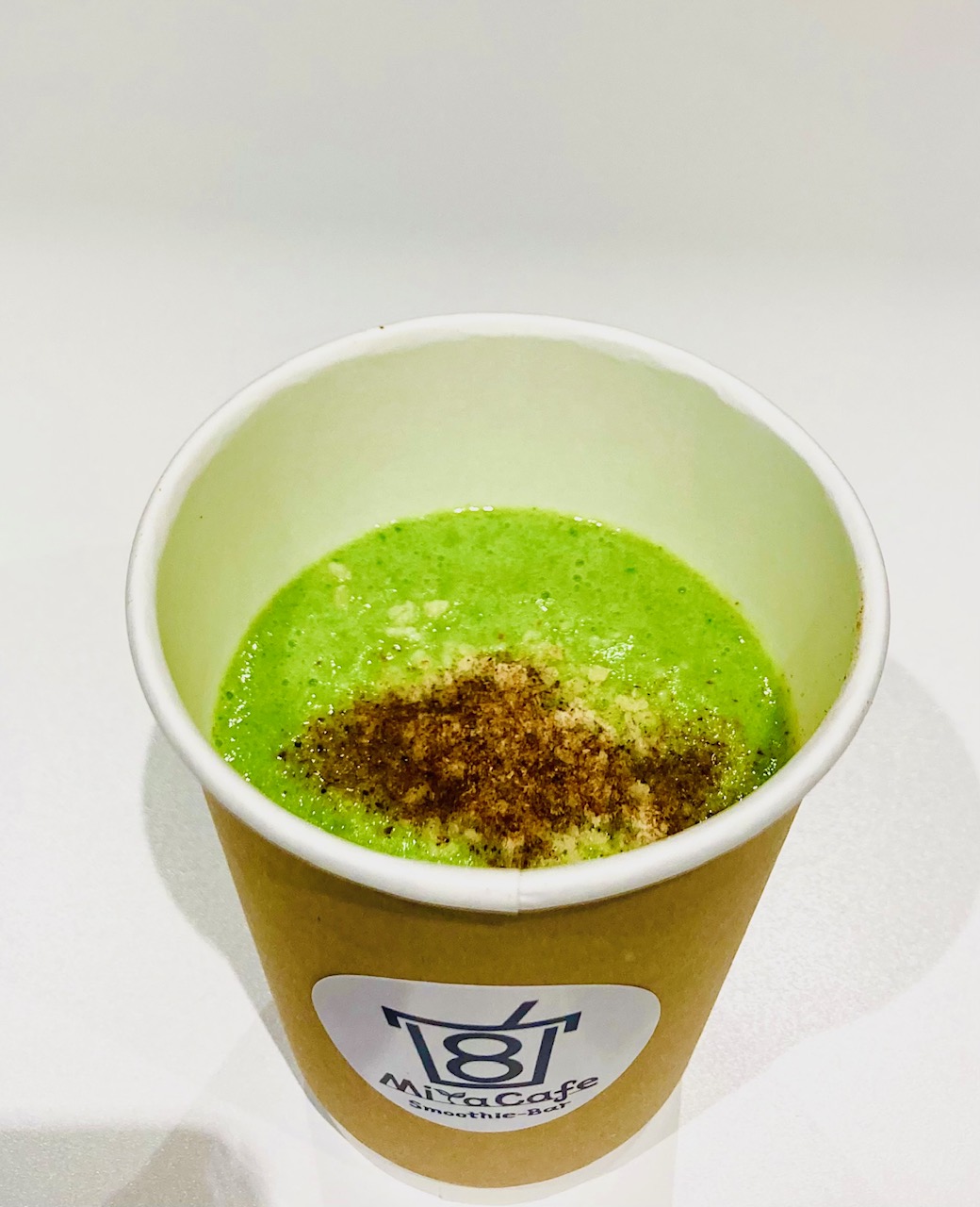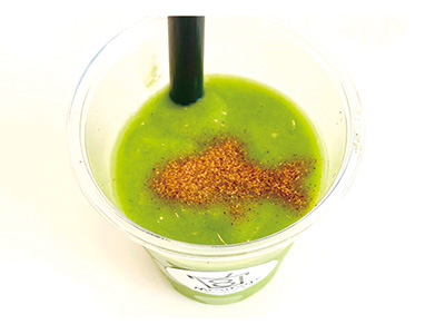 小松菜、アボカド、バナナ、リンゴで作ったグリーンスムージーに、かつおの出汁粉を乗せました。まずはスムージーを一口、そしてその後、出汁粉をまぜてみると、あらあら不思議。和食文化のチカラを感じてください。