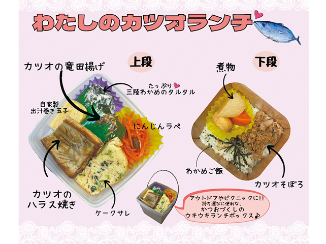 かつおの竜田揚げ・ハラス焼き・そぼろに、ケークサレやにんじんのラぺなどが付いたかつおを堪能できる2段のランチボックスです。