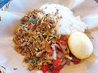 インドネシア・バリ島の伝統料理「ラワール」(肉や野菜をココナッツや香辛料を混ぜて和えたもの)をかつおを使ってアレンジ。ピリ辛なラワールでご飯が進む一品です。