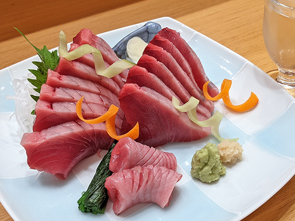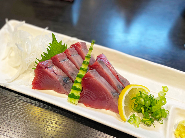 鮮度が良いからこそ、タタキではなく、お刺身で。生姜、にんにく、ねぎなどの薬味をたっぷりつけていただきます。身質のモチモチ感もたまりません。