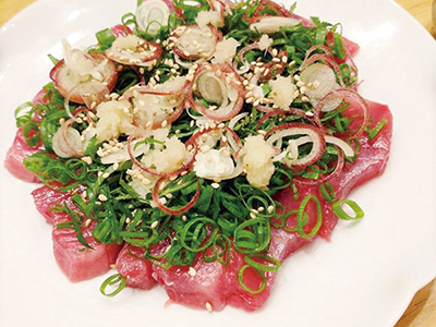 たたきにした鰹を親方特製のたれに漬け込んだ浜の家名物。うすくスライスした玉ねぎと、長芋の千切りがかつおに合い、かつおの旨味が楽しめる逸品です。