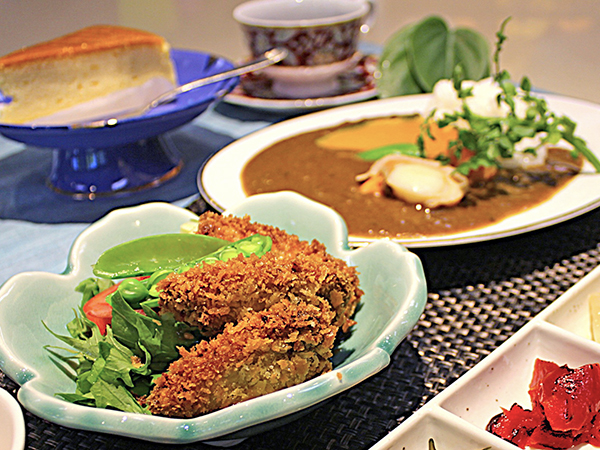 気仙沼産かつおのレアカツと女将の特製欧風ビーフカレー、茶碗蒸し、自家製フルーツビネガードリンク、さらにデザート&コーヒーもついた、女将の愛情と優しがが詰まった、かつお漁伝来350周年記念のランチメニューです。