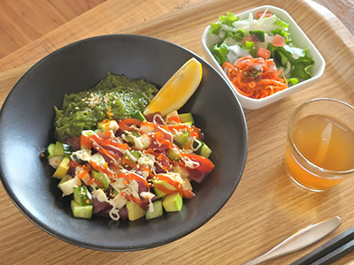 気仙沼港水揚げの新鮮なカツオを使った、夏にぴったりのピリ辛ポキ丼が登場。めかぶや長芋入りで食感も楽しい一品です。辛み抜きも対応可。
