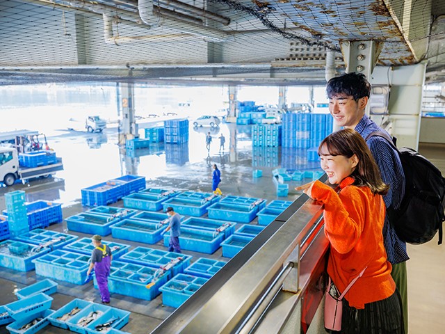 魚が水揚され、活気ある朝の魚市場をガイドがご案内します。漁業に関する貴重な映像が見られる「海と生きるシアター」も見学します。気仙沼が生鮮カツオの水揚げ日本一を記録し続けている理由の解説や、カツオ一本釣り体験もあります。