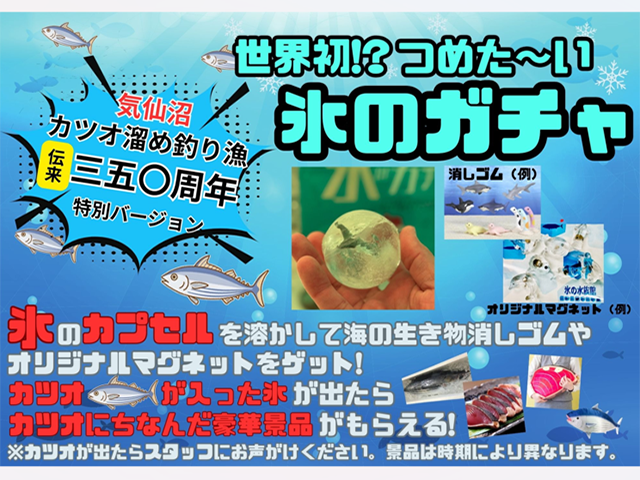 魚の鮮度保持のために欠かせない氷。大きな氷の中で時を止められた魚を見ることができる「氷の水族館」が、珍しい氷のガチャを作りました!氷の中に海の生き物の消しゴムやマグネットが入っており、かつおが出たら豪華景品がもらえます!※氷の水族館への入館が必要です。