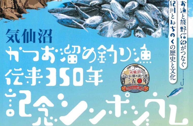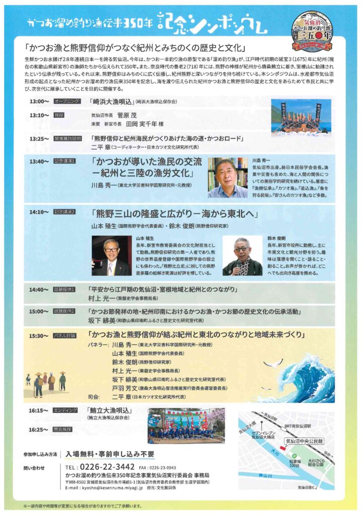 本シンポジウムは、水産都市気仙沼形成の起点となった紀州かつお溜め釣り漁伝来350年を記念し、海を渡り伝えられた紀州かつお漁と熊野信仰の歴史と文化をあらためて市民と共に学び、次世代に継承していくことを目的に開催いたします。
