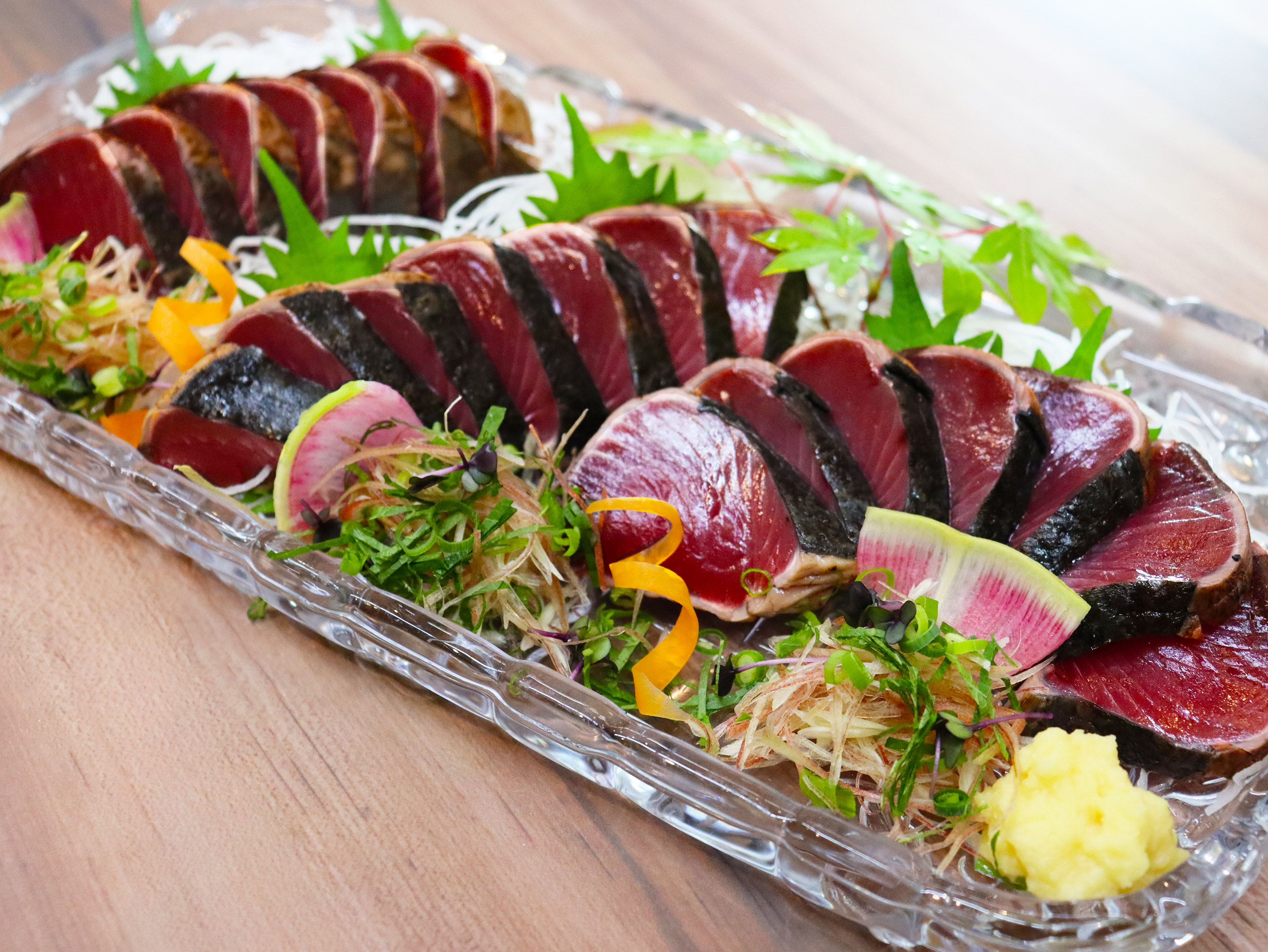 遠洋かつお一本釣り船「亀洋丸」が釣り揚げたカツオを塩麹に漬けた炙りと鹿児島県枕崎産の甘醤油漬けを一度に楽しめる満足度の高いメニューです!