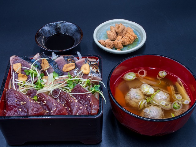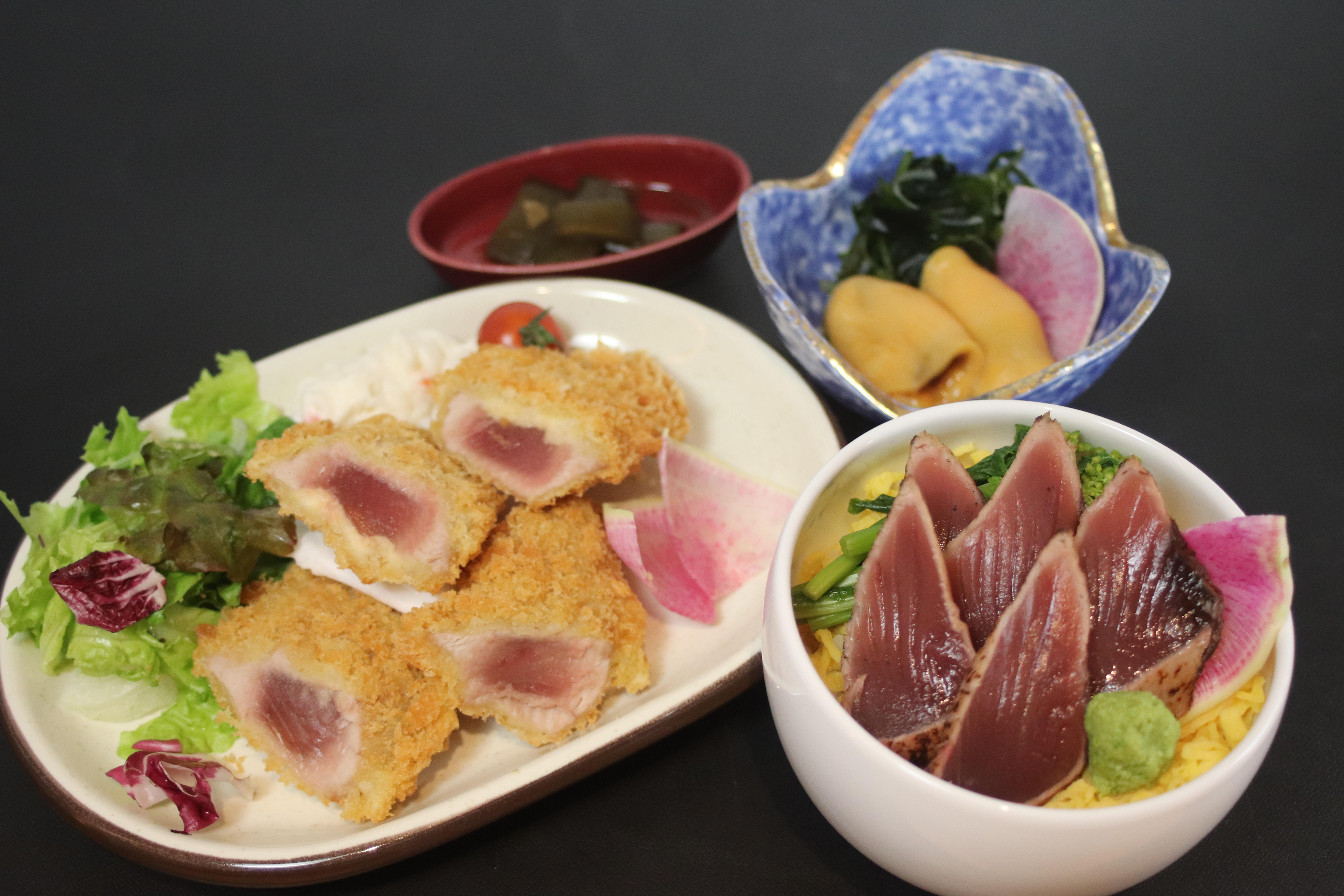 自家製ダレに漬け込んだカツオのたたき丼とレアで揚げたカツオを特製おろしポン酢でお召し上がりいただける定食となっております。