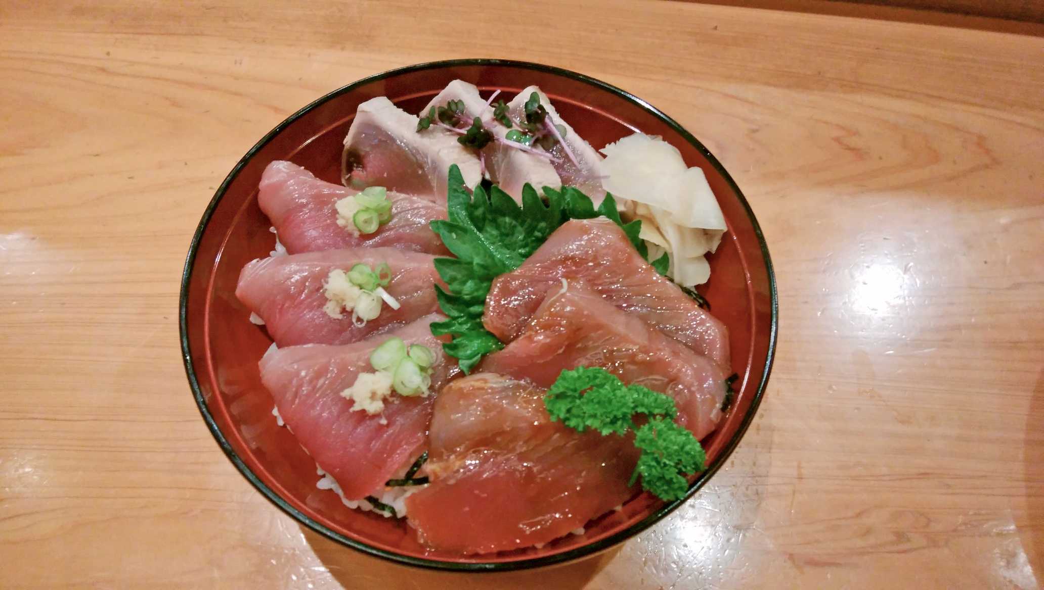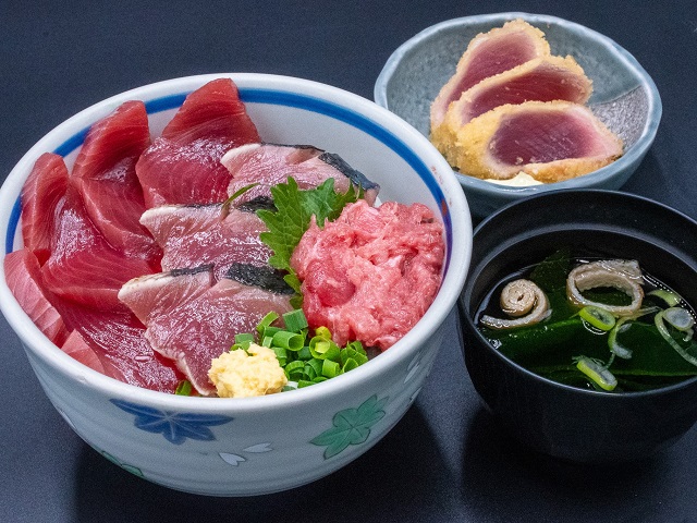 カツオの塩たたき、漬け、生身の3種類を食べ比べできるカツオ丼。小鉢、汁物とセットのランチタイムメニューです。