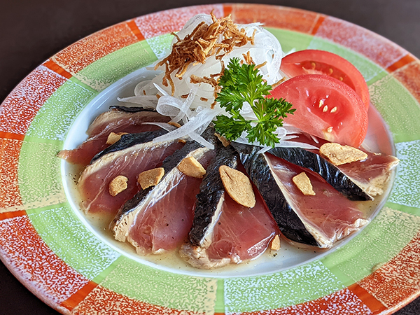 鮮カツオのカルパッチョ、自家製ソースとの組み合わせで味わってください。