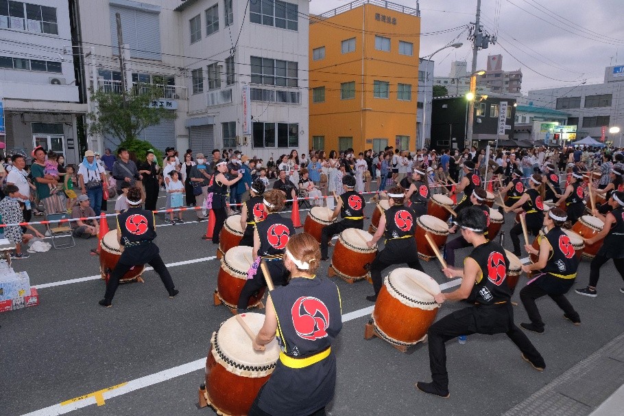 1日目は2,000人以上の参加者で楽しむ「はまらいんや踊り」、2日目は多種多様な演目がみられる「みなとまつりパレード」、約600基の太鼓の音色が響き渡る「打ちばやし大競演」など、様々なイベントが開催されます。まつりのフィナーレは「海上打ち上げ花火」が夜空を彩ります。