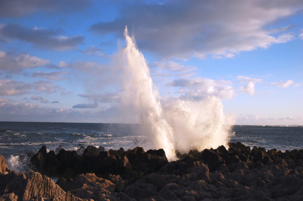 長い年月をかけて海水によって浸食された石灰質の岩の割れ目から潮が吹き上がる光景や、岩井崎復興のシンボル「龍の松」などが見られる景勝地。