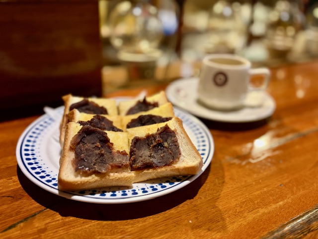 ヴァンガードさんでは、あんトーストやハニー・チーズトースト、ジャムトーストなどが食べられます。食パン2枚分ですが、少な目が良ければ1枚分に変更もできます。あんトーストはマーガリンのほんのりとした塩味にあんこの甘みがいい塩梅です。コーヒーは、マスターが砂時計で時間を計りながらサイフォンを使って一杯ずつ丁寧に淹れてくれるので、香り豊かでまろやかな美味しいコーヒーをいただけます。カウンターでジャズを聴きながらサイフォンでコーヒーを淹れるところを眺めながらいただくコーヒーは言うまでもありません。