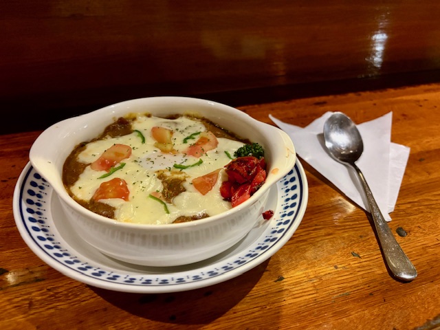 平日ランチはカレーですが、土曜限定で焼きカレーがあります。とろ~りと溶けたチーズの下には卵が隠れており、カレーの優しい辛さに卵とチーズが加わって、まろやかで美味しい焼きカレーなんですよ。熱々をふ~ふ~言いながら食べるのがまたいいんですよね。この焼きカレーもとても人気なんです。