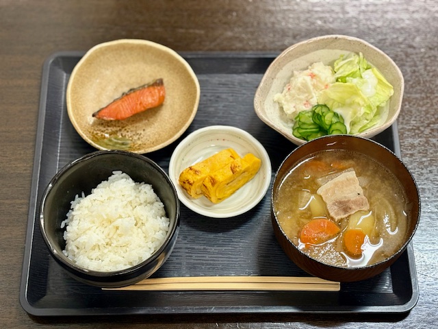 そば茶屋くう兵衛さんでは、具だくさん豚汁の朝ごはんをいただけます。豚汁って、何だかほっこりして幸せな気分になりませんか?しかもその名のとおり具だくさん!サラダ、玉子焼き、焼き鮭の定番朝定食です。こういう朝定食って普段忙しいとなかなか家では作らないけれど、実は日ごろ一番求めている朝ごはんのような気がします。身体にもいいし、ちゃんとした朝ごはんを食べたなぁ、という充足感みたいな…(笑)一番落ち着く朝ごはんではないでしょうか。