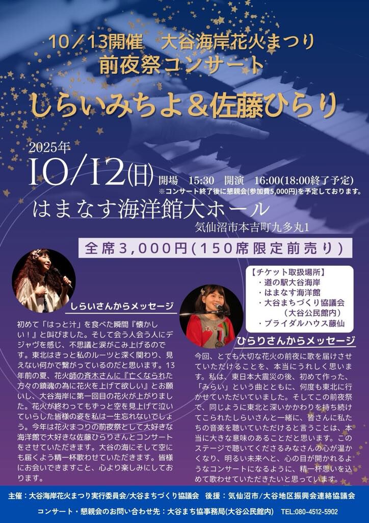 しらいさんは東北の他、熊本や能登の被災地も支援し続けており、齊木さんは世界大会で優勝経験のあるマルゴーの代表。郷土芸能やミニコンサート、しらいさんの歌声と大谷の砂浜を目の前で世界一の花火が彩ります。