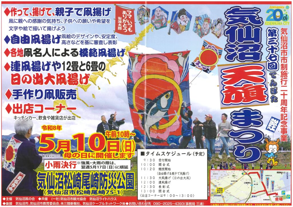 気仙沼の伝統「日の出凧」にちなみ、名人による模範演技、凧揚げ指導や連凧揚げ、競技が行われる「天旗まつり」が開催されます。